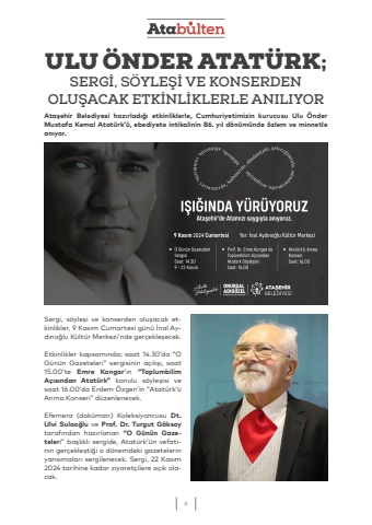 2ULU %u00d6NDER ATAT%u00dcRK;SERG%u0130, S%u00d6YLE%u015e%u0130 VE KONSERDEN OLU%u015eACAK ETK%u0130NL%u0130KLERLE ANILIYORAta%u015fehir Belediyesi haz%u0131rlad%u0131%u011f%u0131 etkinliklerle, Cumhuriyetimizin kurucusu Ulu %u00d6nder Mustafa Kemal Atat%u00fcrk%u2019%u00fc, ebediyete intikalinin 86. y%u0131l d%u00f6n%u00fcm%u00fcnde %u00f6zlem ve minnetle an%u0131yor.Sergi, s%u00f6yle%u015fi ve konserden olu%u015facak etkinlikler,%u00a09 Kas%u0131m Cumartesi g%u00fcn%u00fc%u00a0%u0130nal Ayd%u0131no%u011flu K%u00fclt%u00fcr Merkezi%u2019nde ger%u00e7ekle%u015fecek.%u00a0%u00a0%u00a0Etkinlikler kapsam%u0131nda; saat 14.30%u2019da %u201cO G%u00fcn%u00fcn Gazeteleri%u201d sergisinin a%u00e7%u0131l%u0131%u015f%u0131, saat 15.00%u2019te Emre Kongar%u2019%u0131n %u201cToplumbilim A%u00e7%u0131s%u0131ndan Atat%u00fcrk%u201d konulu s%u00f6yle%u015fisi ve saat 16.00%u2019da Erdem %u00d6zgen%u2019in %u201cAtat%u00fcrk%u2019%u00fc Anma%u00a0Konseri%u201d d%u00fczenlenecek.Efemera (dok%u00fcman) Koleksiyoncusu Dt. Ulvi Sulao%u011flu ve Prof. Dr. Turgut G%u00f6ksoy taraf%u0131ndan haz%u0131rlanan %u201cO G%u00fcn%u00fcn Gazeteleri%u201d ba%u015fl%u0131kl%u0131 sergide, Atat%u00fcrk%u2019%u00fcn vefat%u0131n%u0131n ger%u00e7ekle%u015fti%u011fi o d%u00f6nemdeki gazetelerin yans%u0131malar%u0131 sergilenecek. Sergi, 22 Kas%u0131m 2024 tarihine kadar ziyaret%u00e7ilere a%u00e7%u0131k olacak.