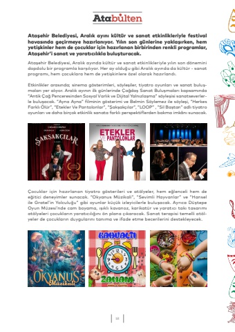 12Ata%u015fehir Belediyesi, Aral%u0131k ay%u0131nda k%u00fclt%u00fcr ve sanat etkinlikleriyle y%u0131l%u0131n son d%u00f6nemini dopdolu bir programla kar%u015f%u0131l%u0131yor. Her ay oldu%u011fu gibi Aral%u0131k ay%u0131nda da k%u00fclt%u00fcr - sanat program%u0131, hem %u00e7ocuklara hem de yeti%u015fkinlere %u00f6zel olarak haz%u0131rland%u0131.Etkinlikler aras%u0131nda; sinema g%u00f6sterimleri, s%u00f6yle%u015filer, tiyatro oyunlar%u0131 ve sanat bulu%u015fmalar%u0131 yer al%u0131yor. Aral%u0131k ay%u0131n%u0131n ilk g%u00fcnlerinde %u00c7a%u011fda%u015f Sanat Bulu%u015fmalar%u0131 kapsam%u0131nda %u201cAntik %u00c7a%u011f Penceresinden Sosyal Varl%u0131k ve Dijital Yaln%u0131zla%u015fma%u201d s%u00f6yle%u015fisi sanatseverlerle bulu%u015facak. %u201cAyna Ayna%u201d filminin g%u00f6sterimi ve Belmin S%u00f6ylemez ile s%u00f6yle%u015fi, %u201cHerkes Farkl%u0131 %u00d6l%u00fcr%u201d, %u201cEtekler Ve Pantolonlar%u201d, %u201c%u015eak%u015fak%u00e7%u0131lar%u201d, %u201cLOOP%u201d , %u201cSil Ba%u015ftan%u201d adl%u0131 tiyatro oyunlar%u0131 ve daha bir%u00e7ok etkinlik sanata farkl%u0131 perspektiflerden bakma imk%u00e2n%u0131 sunacak.%u00c7ocuklar i%u00e7in haz%u0131rlanan tiyatro g%u00f6sterileri ve at%u00f6lyeler, hem e%u011flenceli hem de e%u011fitici deneyimler sunacak. %u201cOkyanus M%u00fczikali%u201d, %u201cSevimli Hayvanlar%u201d ve %u201cHansel ile Gratel%u2019in Yolculu%u011fu%u201d gibi oyunlar k%u00fc%u00e7%u00fck izleyicilerle bulu%u015facak. Ayr%u0131ca D%u00fc%u015ftepe Oyun M%u00fczesi%u2019nde cam boyama, %u0131%u015f%u0131kl%u0131 kavanoz, karikat%u00fcr ve yarat%u0131c%u0131 tak%u0131 tasar%u0131m%u0131 at%u00f6lyeleri %u00e7ocuklar%u0131n yarat%u0131c%u0131l%u0131%u011f%u0131n%u0131 %u00f6n plana %u00e7%u0131karacak. Sanat terapisi temelli at%u00f6lyeler de %u00e7ocuklar%u0131n duygular%u0131n%u0131 tan%u0131ma ve ifade etme becerilerini destekleyecek.Ata%u015fehir Belediyesi, Aral%u0131k ay%u0131n%u0131 k%u00fclt%u00fcr ve sanat etkinlikleriyle festival havas%u0131nda ge%u00e7irmeye haz%u0131rlan%u0131yor. Y%u0131l%u0131n son g%u00fcnlerine yakla%u015f%u0131rken, hem yeti%u015fkinler hem de %u00e7ocuklar i%u00e7in haz%u0131rlanan birbirinden renkli programlar, Ata%u015fehir%u2019i sanat ve yarat%u0131c%u0131l%u0131kla bulu%u015fturacak.