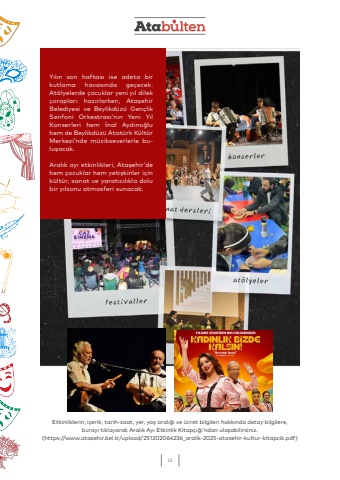 13Etkinliklerin; i%u00e7erik, tarih-saat, yer, ya%u015f aral%u0131%u011f%u0131 ve %u00fccret bilgileri hakk%u0131nda detay bilgilere,buray%u0131 t%u0131klayarak Aral%u0131k Ay%u0131 Etkinlik Kitap%u00e7%u0131%u011f%u0131%u2019ndan ula%u015fabilirsiniz.(https://www.atasehir.bel.tr/upload/251202064236_aralik-2025-atasehir-kultur-kitapcik.pdf)Y%u0131l%u0131n son haftas%u0131 ise adeta bir kutlama havas%u0131nda ge%u00e7ecek. At%u00f6lyelerde %u00e7ocuklar yeni y%u0131l dilek %u00e7oraplar%u0131 haz%u0131rlarken, Ata%u015fehir Belediyesi ve Beylikd%u00fcz%u00fc Gen%u00e7lik Senfoni Orkestras%u0131%u2019n%u0131n Yeni Y%u0131l Konserleri hem %u0130nal Ayd%u0131no%u011flu hem de Beylikd%u00fcz%u00fc Atat%u00fcrk K%u00fclt%u00fcr Merkezi%u2019nde m%u00fczikseverlerle bulu%u015facak. Aral%u0131k ay%u0131 etkinlikleri, Ata%u015fehir%u2019de hem %u00e7ocuklar hem yeti%u015fkinler i%u00e7in k%u00fclt%u00fcr, sanat ve yarat%u0131c%u0131l%u0131kla dolu bir y%u0131lsonu atmosferi sunacak.