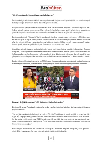 15%u201cHi%u00e7 Kimse Kendini Yaln%u0131z Hissetmesin %u0130stiyoruz%u201dBa%u015fkan Ad%u0131g%u00fczel, ekonomik kriz ve sosyal destek ihtiyac%u0131n%u0131n b%u00fcy%u00fcd%u00fc%u011f%u00fc bir ortamda sosyal belediyecili%u011fin %u00f6neminin daha da artt%u0131%u011f%u0131n%u0131 ifade etti.Sosyal destek %u00e7al%u0131%u015fmalar%u0131n%u0131n kapsam%u0131n%u0131 uzun uzun anlatan Ba%u015fkan Onursal Ad%u0131g%u00fczel, Belediye olarak yaln%u0131z ya%u015fayan ya%u015fl%u0131lar%u0131n, kronik hastalar%u0131n, dar gelirli ailelerin ve %u00e7ocuklar%u0131n g%u00fcnl%u00fck ihtiya%u00e7lar%u0131n%u0131n kar%u015f%u0131lanmas%u0131na d%u00fczenli %u015fekilde destek sa%u011flad%u0131klar%u0131n%u0131 s%u00f6yledi.Ba%u015fkan Ad%u0131g%u00fczel, %u201cAta%u015fehir%u2019de kimse kendini yaln%u0131z hissetmesin istiyoruz. 1.800 kom%u015fumuza her g%u00fcn iki %u00f6%u011f%u00fcn s%u0131cak yemek ula%u015ft%u0131r%u0131yoruz. Bu sadece sosyal yard%u0131m almak zorunda olanlar i%u00e7in de%u011fil; baz%u0131 vatanda%u015flar%u0131m%u0131z b%u00fct%u00e7esi oldu%u011fu h%u00e2lde yemek yapamayacak kadar hasta, ya%u015fl%u0131 ya da engelli olabiliyor. Onlar%u0131 da unutmuyoruz%u201d dedi.%u00c7ocuklara y%u00f6nelik beslenme deste%u011finin de hayati bir ihtiya%u00e7 h%u00e2line geldi%u011fini dile getiren Ba%u015fkan Ad%u0131g%u00fczel, %u201c1500 %u00f6%u011frencinin beslenme %u00e7antalar%u0131n%u0131 haftal%u0131k olarak dolduruyoruz. Anne-Babalar %u2018Bu hafta %u00e7ocu%u011fumun beslenmesine ne koyaca%u011f%u0131m?%u2019 diye d%u00fc%u015f%u00fcnmesin istiyoruz. Bu %u00e7ok basit bir %u015fey gibi g%u00f6r%u00fcn%u00fcr ama bug%u00fcn %u00fclkedeki milyonlarca aile i%u00e7in en temel mesele bu.%u201d a%u00e7%u0131klamas%u0131nda bulundu. Ba%u015fkan Onursal Ad%u0131g%u00fczel, ayr%u0131ca her ay 3000%u2019e yak%u0131n haneye g%u0131da ve kahvalt%u0131 deste%u011fi, ya%u015fl%u0131 ve hastalara ev temizli%u011fi, evde bak%u0131m, kuaf%u00f6r hizmeti, hasta yata%u011f%u0131 ve bebek bezi deste%u011fi sa%u011flad%u0131klar%u0131n%u0131 da belirtti.%u00dccretsiz Sa%u011fl%u0131k Hizmetleri: %u201c130 Bini A%u015fk%u0131n Ki%u015fiye Dokunduk%u201dBa%u015fkan Onursal Ad%u0131g%u00fczel, sa%u011fl%u0131k alan%u0131nda yap%u0131lan i%u015fleri anlat%u0131rken de hizmet politikas%u0131n%u0131 %u015f%u00f6yle %u00f6zetledi:%u201c%u00dc%u00e7 sa%u011fl%u0131k merkezimizde bug%u00fcne kadar 130 bin 790 ki%u015fiye %u00fccretsiz sa%u011fl%u0131k hizmeti verdik. A%u011f%u0131z-di%u015f sa%u011fl%u0131%u011f%u0131ndan g%u00f6z b%u00f6l%u00fcm%u00fcne, kad%u0131n hastal%u0131klar%u0131ndan dahiliyeye kadar t%u00fcm hizmetler %u00fccretsiz veriliyor. Ayr%u0131ca 7.500 metrekarelik yeni bir t%u0131p merkezimiz tamamland%u0131; sadece ruhsat s%u00fcrecimizi bekliyoruz. %u00d6zel hastane standartlar%u0131nda bir merkezi halk%u0131m%u0131z%u0131n hizmetine sunaca%u011f%u0131z.%u201dEvde sa%u011fl%u0131k hizmetinin de kesintisiz s%u00fcrd%u00fc%u011f%u00fcn%u00fc aktaran Ba%u015fkan Ad%u0131g%u00fczel, %u00f6zel gereksinimli 3 bin hastaya evlerinde hizmet g%u00f6t%u00fcr%u00fcld%u00fc%u011f%u00fcn%u00fc ifade etti.