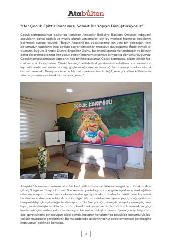 4%u201cHer %u00c7ocuk E%u015fittir %u0130nanc%u0131m%u0131z%u0131 Somut Bir Yap%u0131ya D%u00f6n%u00fc%u015ft%u00fcr%u00fcyoruz%u201d%u00c7ocuk Kamp%u00fcs%u00fc%u2019n%u00fcn a%u00e7%u0131l%u0131%u015f%u0131nda konu%u015fan Ata%u015fehir Belediye Ba%u015fkan%u0131 Onursal Ad%u0131g%u00fczel, %u00e7ocuklar%u0131n daha sa%u011fl%u0131kl%u0131 ve mutlu olarak yeti%u015fmeleri i%u00e7in bu merkezi hizmete a%u00e7t%u0131klar%u0131n%u0131 belirterek %u015funlar%u0131 s%u00f6yledi: %u201cBug%u00fcn Ata%u015fehir%u2019de, %u00e7ocuklar%u0131m%u0131z i%u00e7in yeni bir gelece%u011fin, yeni bir umudun kap%u0131lar%u0131n%u0131 hep birlikte a%u00e7%u0131yor olmaktan mutluluk duydu%u011fumu ifade etmek istiyorum. Bug%u00fcn, 3 Aral%u0131k D%u00fcnya Engelliler G%u00fcn%u00fc. Bu %u00f6nemli g%u00fcnde fark%u0131ndal%u0131%u011f%u0131n ve bilincin daha da artmas%u0131 ad%u0131na %u2018her %u00e7ocuk e%u015fittir%u2019 inanc%u0131m%u0131z%u0131 somut bir yap%u0131ya d%u00f6n%u00fc%u015ft%u00fcrd%u00fc%u011f%u00fcm%u00fcz, %u00c7ocuk Kamp%u00fcs%u00fcm%u00fcz%u00fcn kap%u0131lar%u0131n%u0131 hep birlikte a%u00e7%u0131yoruz. %u00c7ocuk Kamp%u00fcs%u00fc, bizim i%u00e7in bir hizmetten %u00e7ok daha fazlas%u0131. %u00c7%u00fcnk%u00fc buras%u0131; %u00f6zellikle %u00f6zel gereksinimli evlatlar%u0131m%u0131z%u0131n ve onlar%u0131n k%u0131ymetli ailelerinin nefes alaca%u011f%u0131, g%u00fc%u00e7lenece%u011fi, destek bulaca%u011f%u0131 bir dayan%u0131%u015fma alan%u0131 olarak hizmet verecek. Buray%u0131 sadece bir hizmet mekan%u0131 olarak de%u011fil, yerel y%u00f6netim k%u00fclt%u00fcr%u00fcm%u00fcz%u00fcn bir yans%u0131mas%u0131 olarak hizmete a%u00e7%u0131yoruz%u201d.Ata%u015fehir%u2019de insan%u0131 merkeze alan bir kent k%u00fclt%u00fcr%u00fc in%u015fa ettiklerini vurgulayan Ba%u015fkan Ad%u0131g%u00fczel, %u201cEngelsiz Sosyal Hizmet Merkezimiz; psikologlardan ergoterapistlere, %u00f6zel e%u011fitimcilerden sosyal hizmet uzmanlar%u0131na kadar geni%u015f bir ekip taraf%u0131ndan y%u00fcr%u00fct%u00fclen kapsaml%u0131 bir destek sistemine sahip. Ama bizi di%u011fer t%u00fcm modellerden ay%u0131ran %u015fey; %u00e7ocu%u011fu yaln%u0131zca bireysel ihtiya%u00e7lar%u0131yla de%u011ferlendirmiyoruz. Biz her %u00e7ocu%u011fa; ailesiyle, sosyal %u00e7evresiyle, okuluyla, mahallesiyle birlikte bir b%u00fct%u00fcn olarak bak%u0131yoruz ve biz bu b%u00fct%u00fcn%u00fc korumak ve g%u00fc%u00e7lendirmek i%u00e7in aileleri yaln%u0131z b%u0131rakmayan bir sistem olu%u015fturuyoruz. %u015eunu %u00e7ok iyi biliyorum, %u00f6zel gereksinimli bir %u00e7ocu%u011fun ailesi olmak, hayat%u0131n her alan%u0131nda b%u00fcy%u00fck bir sorumluluk, b%u00fcy%u00fck bir m%u00fccadele gerektiriyor. Bu m%u00fccadelede ailelerin yaln%u0131z b%u0131rak%u0131lamamas%u0131 gerekti%u011fine inan%u0131yoruz%u201d %u015feklinde konu%u015ftu.