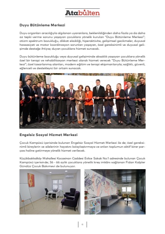 6Duyu B%u00fct%u00fcnleme MerkeziDuyu organlar%u0131 arac%u0131l%u0131%u011f%u0131yla alg%u0131lanan uyaranlara, beklenildi%u011finden daha fazla ya da daha az tepki verme sorunu ya%u015fayan %u00e7ocuklara y%u00f6nelik kurulan %u201cDuyu B%u00fct%u00fcnleme Merkezi%u201d; otizm spektrum bozuklu%u011fu, dikkat eksikli%u011fi, hiperaktivite, geli%u015fimsel gecikmeler, duyusal hassasiyet ve motor koordinasyon sorunlar%u0131 ya%u015fayan, %u00f6zel gereksinimli ve duyusal geli%u015fimde deste%u011fe ihtiya%u00e7 duyan %u00e7ocuklara hizmet sunacak.Duyu b%u00fct%u00fcnleme bozuklu%u011fu veya duyusal geli%u015fiminde aksakl%u0131k ya%u015fayan %u00e7ocuklara y%u00f6nelik %u00f6zel bir terapi ve rehabilitasyon merkezi olarak hizmet verecek %u201cDuyu B%u00fct%u00fcnleme Merkezi%u201d; %u00f6zel tasarlanm%u0131%u015f alanlar%u0131, modern e%u011fitim ve terapi ekipmanlar%u0131yla; sa%u011fl%u0131kl%u0131, g%u00fcvenli, e%u011flenceli ve destekleyici bir ortam sunacak.Engelsiz Sosyal Hizmet Merkezi%u00c7ocuk Kamp%u00fcs%u00fc i%u00e7erisinde bulunan Engelsiz Sosyal Hizmet Merkezi ile de; %u00f6zel gereksinimli bireylerin ve ailelerinin hayat%u0131n%u0131 kolayla%u015ft%u0131rmaya ve onlar%u0131 toplumun aktif birer par%u00e7as%u0131 haline getirmeye y%u00f6nelik hizmet verilecek. K%u00fc%u00e7%u00fckbakkalk%u00f6y Mahallesi Kocasinan Caddesi Evlice Sokak No:1 adresinde bulunan %u00c7ocuk Kamp%u00fcs%u00fc i%u00e7erisinde; 36 - 66 ayl%u0131k %u00e7ocuklara y%u00f6nelik kre%u015f imk%u00e2n%u0131 sa%u011flanan Fidan Kalpler G%u00fcnd%u00fcz %u00c7ocuk Bak%u0131mevi de bulunuyor.