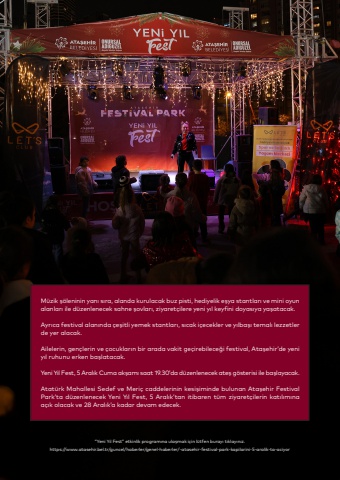 8M%u00fczik %u015f%u00f6leninin yan%u0131 s%u0131ra, alanda kurulacak buz pisti, hediyelik e%u015fya stantlar%u0131 ve mini oyun alanlar%u0131 ile d%u00fczenlenecek sahne %u015fovlar%u0131, ziyaret%u00e7ilere yeni y%u0131l keyfini doyas%u0131ya ya%u015fatacak. Ayr%u0131ca festival alan%u0131nda %u00e7e%u015fitli yemek stantlar%u0131, s%u0131cak i%u00e7ecekler ve y%u0131lba%u015f%u0131 temal%u0131 lezzetler de yer alacak. Ailelerin, gen%u00e7lerin ve %u00e7ocuklar%u0131n bir arada vakit ge%u00e7irebilece%u011fi festival, Ata%u015fehir%u2019de yeni y%u0131l ruhunu erken ba%u015flatacak.Yeni Y%u0131l Fest, 5 Aral%u0131k Cuma ak%u015fam%u0131 saat 19.30%u2019da d%u00fczenlenecek ate%u015f g%u00f6sterisi ile ba%u015flayacak. Atat%u00fcrk Mahallesi Sedef ve Meri%u00e7 caddelerinin kesi%u015fiminde bulunan Ata%u015fehir Festival Park%u2019ta d%u00fczenlenecek Yeni Y%u0131l Fest, 5 Aral%u0131k%u2019tan itibaren t%u00fcm ziyaret%u00e7ilerin kat%u0131l%u0131m%u0131na a%u00e7%u0131k olacak ve 28 Aral%u0131k%u2019a kadar devam edecek.%u201cYeni Y%u0131l Fest%u201d etkinlik program%u0131na ula%u015fmak i%u00e7in l%u00fctfen buray%u0131 t%u0131klay%u0131n%u0131z.https://www.atasehir.bel.tr/guncel/haberler/genel-haberler/-atasehir-festival-park-kapilarini-5-aralik-ta-aciyor