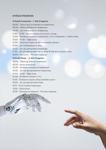 18ETK%u0130NL%u0130K PROGRAMI:%u00a013 Aral%u0131k Cumartesi%u00a0%u2013 1. G%u00fcn Program%u013109.00 - Tak%u0131m giri%u015f ve kay%u0131tlar%u0131n%u0131n ba%u015flamas%u013109.00 - Robot tefti%u015flerinin ba%u015flamas%u013110.00 - J%u00fcri m%u00fclakatlar%u0131n%u0131n ba%u015flamas%u013111.30 - 12.00 %u2013 S%u00fcr%u00fcc%u00fc toplant%u0131s%u0131 ve soru%u2013cevap12.00 - Deneme ma%u00e7lar%u0131n%u0131n ba%u015flamas%u0131 / J%u00fcri m%u00fclakatlar%u0131 1. b%u00f6l%u00fcm biti%u015fi13.00 - 14.00 %u2013 %u00d6%u011fle aras%u013114.00 - Deneme ma%u00e7lar%u0131 & j%u00fcri m%u00fclakatlar%u0131 devam15.30 - J%u00fcri m%u00fclakatlar%u0131n%u0131n biti%u015fi15.30 - J%u00fcri pit g%u00f6r%u00fc%u015fmeleri ba%u015flang%u0131c%u013117.30 - J%u00fcri pit g%u00f6r%u00fc%u015fmeleri ilk tur biti%u015fi & Deneme ma%u00e7lar%u0131 biti%u015fi18.00 - G%u00fcn sonu %u2013 Pit alan%u0131 kapan%u0131%u015f%u013114 Aral%u0131k Pazar%u00a0%u2013 2. G%u00fcn Program%u013109.00 - Tak%u0131m giri%u015flerinin ba%u015flamas%u013109.30 - A%u00e7%u0131l%u0131%u015f seremonisi10.00 - S%u0131ralama ma%u00e7lar%u0131n%u0131n ba%u015flamas%u013110.30 - J%u00fcri pit g%u00f6r%u00fc%u015fmelerinin ba%u015flamas%u013113.00 - 14.00 - %u00d6%u011fle aras%u013114.00 - S%u0131ralama ma%u00e7lar%u0131 2. tur15.45 - S%u0131ralama ma%u00e7lar%u0131 biti%u015fi & %u0130ttifak se%u00e7imi16.00 - J%u00fcri pit g%u00f6r%u00fc%u015fmeleri biti%u015fi16.15 - Final ma%u00e7lar%u0131 ba%u015flang%u0131c%u013117.00 - %u00d6d%u00fcl t%u00f6reni18.30 - %u015eampiyona kapan%u0131%u015f%u0131 - Pit alan%u0131 kapan%u0131%u015f%u0131