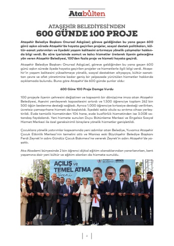 2ATA%u015eEH%u0130R BELED%u0130YES%u0130%u2019NDEN600 G%u00dcNDE 100 PROJEAta%u015fehir Belediye Ba%u015fkan%u0131 Onursal Ad%u0131g%u00fczel; g%u00f6reve geldi%u011finden bu yana ge%u00e7en 600 g%u00fcn%u00fc a%u015fk%u0131n s%u00fcrede Ata%u015fehir%u2019de hayata ge%u00e7irilen projeler, sosyal destek politikalar%u0131, k%u00fclt%u00fcr-sanat yat%u0131r%u0131mlar%u0131 ve il%u00e7edeki ya%u015fam kalitesini art%u0131rmaya y%u00f6nelik %u00e7al%u0131%u015fmalar hakk%u0131nda bilgi verdi. Bu s%u00fcre i%u00e7erisinde somut ve kal%u0131c%u0131 hizmetler %u00fcreterek il%u00e7enin gelece%u011fine y%u00f6n veren Ata%u015fehir Belediyesi, 100%u2019den fazla proje ve hizmeti hayata ge%u00e7irdi.Ata%u015fehir Belediye Ba%u015fkan%u0131 Onursal Ad%u0131g%u00fczel, g%u00f6reve geldi%u011finden bu yana ge%u00e7en 600 g%u00fcn%u00fc a%u015fk%u0131n s%u00fcrede il%u00e7ede hayata ge%u00e7irilen projeler ve hizmetlerle ilgili bilgi verdi. Ata%u015fehir%u2019in ya%u015fam kalitesini y%u00fckseltmeye y%u00f6nelik, sosyal destekten altyap%u0131ya, k%u00fclt%u00fcr-sanattan %u00e7evre ve afet y%u00f6netimine kadar geni%u015f bir yelpazede y%u00fcr%u00fct%u00fclen hizmetler hakk%u0131nda a%u00e7%u0131klamada bulundu. Buna g%u00f6re Ata%u015fehir%u2019de 600 g%u00fcnde %u015funlar oldu: 600 G%u00fcne 100 Proje Damga Vurdu 100 projeyle il%u00e7enin %u00e7ehresini de%u011fi%u015ftiren ve kapsaml%u0131 bir d%u00f6n%u00fc%u015f%u00fcme imza atan Ata%u015fehir Belediyesi, A%u015fevini yenileyerek kapasitesini art%u0131rd%u0131 ve 1.500 %u00f6%u011frenciye toplam 262 bin 500 %u00f6%u011f%u00fcn beslenme deste%u011fi sa%u011flad%u0131. Ayr%u0131ca 1.000 %u00f6%u011frenciye k%u0131rtasiye deste%u011fi verilirken, %u00fccretsiz %u00e7ama%u015f%u0131rhane hizmeti de ba%u015flat%u0131ld%u0131. %u0130l%u00e7edeki sekiz okula su ar%u0131tma cihaz%u0131 yerle%u015ftirildi. Evde temizlik hizmetinden 104 hane, evde kuaf%u00f6rl%u00fck hizmetinden ise 3.008 vatanda%u015f faydaland%u0131. Yeni hizmete sunulan Duyu B%u00fct%u00fcnleme Merkezi ve Engelsiz Sosyal Hizmet Merkezi ile %u00f6zel gereksinimli bireylere y%u00f6nelik hizmetler geni%u015fletildi.%u00c7ocuklara y%u00f6nelik yat%u0131r%u0131mlar kapsam%u0131nda yeni ad%u0131mlar atan Belediye, Yuvam%u0131z Ata%u015fehir %u00c7ocuk Etkinlik Merkezi%u2019nin temelini att%u0131 ve Manisa eski B%u00fcy%u00fck%u015fehir Belediye Ba%u015fkan%u0131 Ferdi Zeyrek%u2019in ad%u0131n%u0131 G%u00fcnd%u00fcz %u00c7ocuk Bak%u0131mevi%u2019ne vererek Zeyrek%u2019in ad%u0131n%u0131 Ata%u015fehir%u2019de ya%u015fatt%u0131. Ata Akademi b%u00fcnyesinde 2 bin %u00f6%u011frenci dijital e%u011fitim olanaklar%u0131ndan yararlan%u0131rken, kent ya%u015fam%u0131na dair yeni k%u00fclt%u00fcr ve e%u011fitim alanlar%u0131 da hizmete sunuldu.