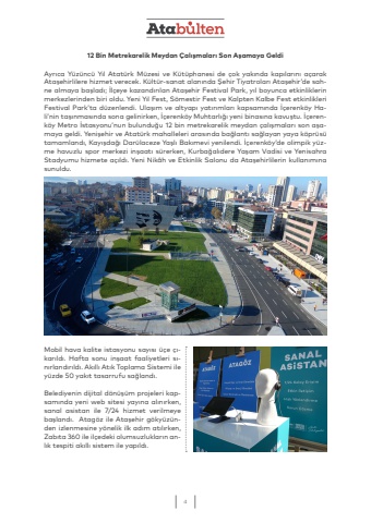 412 Bin Metrekarelik Meydan %u00c7al%u0131%u015fmalar%u0131 Son A%u015famaya GeldiAyr%u0131ca Y%u00fcz%u00fcnc%u00fc Y%u0131l Atat%u00fcrk M%u00fczesi ve K%u00fct%u00fcphanesi de %u00e7ok yak%u0131nda kap%u0131lar%u0131n%u0131 a%u00e7arak Ata%u015fehirlilere hizmet verecek. K%u00fclt%u00fcr-sanat alan%u0131nda %u015eehir Tiyatrolar%u0131 Ata%u015fehir%u2019de sahne almaya ba%u015flad%u0131; %u0130l%u00e7eye kazand%u0131r%u0131lan Ata%u015fehir Festival Park, y%u0131l boyunca etkinliklerin merkezlerinden biri oldu. Yeni Y%u0131l Fest, S%u00f6mestir Fest ve Kalpten Kalbe Fest etkinlikleri Festival Park%u2019ta d%u00fczenlendi. Ula%u015f%u0131m ve altyap%u0131 yat%u0131r%u0131mlar%u0131 kapsam%u0131nda %u0130%u00e7erenk%u00f6y Hali%u2019nin ta%u015f%u0131nmas%u0131nda sona gelinirken, %u0130%u00e7erenk%u00f6y Muhtarl%u0131%u011f%u0131 yeni binas%u0131na kavu%u015ftu. %u0130%u00e7erenk%u00f6y Metro %u0130stasyonu%u2019nun bulundu%u011fu 12 bin metrekarelik meydan %u00e7al%u0131%u015fmalar%u0131 son a%u015famaya geldi. Yeni%u015fehir ve Atat%u00fcrk mahalleleri aras%u0131nda ba%u011flant%u0131 sa%u011flayan yaya k%u00f6pr%u00fcs%u00fc tamamland%u0131, Kay%u0131%u015fda%u011f%u0131 Dar%u00fclaceze Ya%u015fl%u0131 Bak%u0131mevi yenilendi. %u0130%u00e7erenk%u00f6y%u2019de olimpik y%u00fczme havuzlu spor merkezi in%u015faat%u0131 s%u00fcrerken, Kurba%u011fal%u0131dere Ya%u015fam Vadisi ve Yenisahra Stadyumu hizmete a%u00e7%u0131ld%u0131. Yeni Nik%u00e2h ve Etkinlik Salonu da Ata%u015fehirlilerin kullan%u0131m%u0131na sunuldu.Mobil hava kalite istasyonu say%u0131s%u0131 %u00fc%u00e7e %u00e7%u0131kar%u0131ld%u0131. Hafta sonu in%u015faat faaliyetleri s%u0131n%u0131rland%u0131r%u0131ld%u0131. Ak%u0131ll%u0131 At%u0131k Toplama Sistemi ile y%u00fczde 50 yak%u0131t tasarrufu sa%u011fland%u0131.Belediyenin dijital d%u00f6n%u00fc%u015f%u00fcm projeleri kapsam%u0131nda yeni web sitesi yay%u0131na al%u0131n%u0131rken, sanal asistan ile 7/24 hizmet verilmeye ba%u015fland%u0131. Atag%u00f6z ile Ata%u015fehir g%u00f6ky%u00fcz%u00fcnden izlenmesine y%u00f6nelik ilk ad%u0131m at%u0131l%u0131rken, Zab%u0131ta 360 ile il%u00e7edeki olumsuzluklar%u0131n anl%u0131k tespiti ak%u0131ll%u0131 sistem ile yap%u0131ld%u0131.