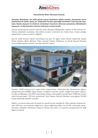 6Hizmetlerde Rekor Seviyeye Ula%u015f%u0131ld%u0131Ata%u015fehir Belediyesi, son 600 g%u00fcnde sosyal destekten k%u00fclt%u00fcr-sanata, altyap%u0131dan %u00e7evre %u00e7al%u0131%u015fmalar%u0131na kadar geni%u015f bir yelpazede hayata ge%u00e7irdi%u011fi hizmetleri kamuoyuyla payla%u015ft%u0131. %u0130l%u00e7ede ya%u015fayan on binlerce vatanda%u015f%u0131n hayat%u0131na dokunan %u00e7al%u0131%u015fmalar, Belediyenin kapsay%u0131c%u0131 ve dayan%u0131%u015fmac%u0131 hizmet anlay%u0131%u015f%u0131n%u0131 ortaya koydu.Sosyal yard%u0131mlarda %u00f6nemli ad%u0131mlar atan Ata%u015fehir Belediyesi, toplam 5.310 ihtiya%u00e7 sahibine; tekerlekli sandalye, kahvalt%u0131l%u0131k yard%u0131m, kurbanl%u0131k et, hasta bezi, hasta yata%u011f%u0131, bebek bezi ve e%u015fya yard%u0131m%u0131 sa%u011flad%u0131. Ayr%u0131ca 1.656 ihtiya%u00e7 sahibi vatanda%u015fa her g%u00fcn iki %u00f6%u011f%u00fcn s%u0131cak yemek ula%u015ft%u0131r%u0131ld%u0131. %u0130l%u00e7ede Fidan Kalpler, Bahri Beh%u00e7et Y%u0131ld%u0131z, Saadet Hasan G%u00fclbaran ve Ferdi Zeyrek G%u00fcnd%u00fcz %u00c7ocuk Bak%u0131mevleri hizmet vermeye devam ediyor.Toplam 2.568 haneye kuru g%u0131da kolisi ula%u015ft%u0131r%u0131l%u0131rken, Ataevleri%u2019nde d%u00fczenlenen e%u011fitim programlar%u0131yla 93.887 ki%u015fiye at%u00f6lye ve e%u011fitim hizmeti verildi. Sa%u011fl%u0131k hizmetleri kapsam%u0131nda ise Belediye, 145.000 vatanda%u015fa ula%u015ft%u0131; evde sa%u011fl%u0131k hizmetinden 2.818 ki%u015fi, hasta nakil hizmetinden 1.115 ki%u015fi yararland%u0131. Yeni Hayat Gen%u00e7lik Merkezi arac%u0131l%u0131%u011f%u0131yla 10.069 ki%u015fiye psikolojik destek sunuldu.E%u011fitim ve sanat alan%u0131nda da g%u00fc%u00e7l%u00fc bir performans sergilendi. Ders destek program%u0131ndan 400 lise ve %u00fcniversite %u00f6%u011frencisi, sanat e%u011fitimlerinden ise 14.254 vatanda%u015f yararlan%u0131rken; Ata%u015fehir Monheim Tasar%u0131m Okulu%u2019nda bilim ve tasar%u0131m programlar%u0131na 308 %u00f6%u011frenci kat%u0131ld%u0131.
