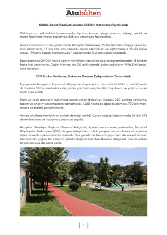 7K%u00fclt%u00fcr-Sanat Faaliyetlerinden 538 Bin Vatanda%u015f Faydaland%u0131K%u00fclt%u00fcr-sanat etkinlikleri kapsam%u0131nda; tiyatro, konser, sergi, sinema, s%u00f6yle%u015fi, %u015fenlik ve m%u00fcze faaliyetlerinden toplamda 538 bin vatanda%u015f faydaland%u0131. %u00c7evre %u00e7al%u0131%u015fmalar%u0131n%u0131 da g%u00fc%u00e7lendiren Ata%u015fehir Belediyesi, 15 binden fazla ki%u015fiye %u00e7evre bilinci kazand%u0131rd%u0131, 17 bin ton at%u0131k toplad%u0131, %u00e7evre etkinlikleri ve e%u011fitimleriyle 15.123 ki%u015fiye ula%u015ft%u0131. %u201cPlastik Kapak Kampanyas%u0131%u201d kapsam%u0131nda 11,2 ton kapak topland%u0131. Spor alan%u0131nda 29.004 ki%u015fiye e%u011fitim verilirken, yaz ve k%u0131%u015f spor programlar%u0131ndan 15 binden fazla ki%u015fi yararland%u0131. %u00c7a%u011fr%u0131 Merkezi ise 20 ayl%u0131k s%u00fcrede gelen %u00e7a%u011fr%u0131lar%u0131n %96,5%u2019ini ba%u015far%u0131yla kar%u015f%u0131lad%u0131.250 Park%u0131n Yenileme, Bak%u0131m ve Onar%u0131m %u00c7al%u0131%u015fmalar%u0131n%u0131 Tamamlad%u0131%u0130l%u00e7e genelinde yap%u0131lan kapsaml%u0131 altyap%u0131 ve ula%u015f%u0131m yat%u0131r%u0131mlar%u0131nda 66.664 ton asfalt serildi, toplam 56 bin metrekare de; parke yol, tretuvar, bord%u00fcr, ta%u015f duvar ve ya%u011fmur suyu hatt%u0131 in%u015fa edildi.Park ve ye%u015fil alanlar%u0131n bak%u0131m%u0131na %u00f6nem veren Belediye, %u0130l%u00e7edeki 250 parkta yenileme, bak%u0131m ve onar%u0131m %u00e7al%u0131%u015fmalar%u0131n%u0131 tamamlad%u0131. 1.265 noktada a%u011fa%u00e7 budamas%u0131, 770 bin metrekare ot bi%u00e7imi ger%u00e7ekle%u015ftirdi. Ayr%u0131ca okullara temizlik ve bak%u0131m deste%u011fi verildi. %u00c7evre sa%u011fl%u0131%u011f%u0131 kapsam%u0131nda 26 bin 293 dezenfeksiyon ve ila%u00e7lama %u00e7al%u0131%u015fmas%u0131 yap%u0131ld%u0131.Ata%u015fehir Belediye Ba%u015fkan%u0131 Onursal Ad%u0131g%u00fczel, il%u00e7ede devam eden yat%u0131r%u0131mlar, %u0130stanbul B%u00fcy%u00fck%u015fehir Belediyesi (%u0130BB) ile ger%u00e7ekle%u015ftirilen ortak projeler ve planlama s%u00fcre%u00e7lerine ili%u015fkin %u00f6nemli a%u00e7%u0131klamalarda bulundu. %u0130l%u00e7e genelinde hem altyap%u0131 hem de sosyal hizmet alanlar%u0131nda yo%u011fun bir %u00e7al%u0131%u015fma y%u00fcr%u00fct%u00fcld%u00fc%u011f%u00fcn%u00fc belirten Ba%u015fkan Ad%u0131g%u00fczel, merak edilen bir%u00e7ok konuya da yan%u0131t verdi.